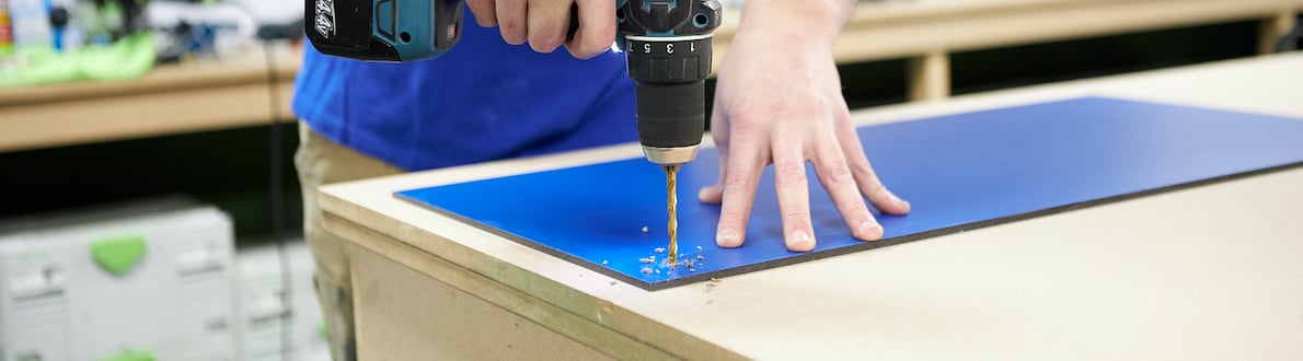 Use either an HPL drill bit or a wood drill bit. It’s essential to drill a hole that’s at least 2 to 3 mm larger than the screw’s diameter. Begin drilling from the visible side for the cleanest result. Maintain a distance of at least twice the panel’s thickness from the edge. Mark the drill holes with masking tape, and make sure there is a maximum spacing of 450 mm for screw stability. For broader panels, we recommend mounting points in the centre.