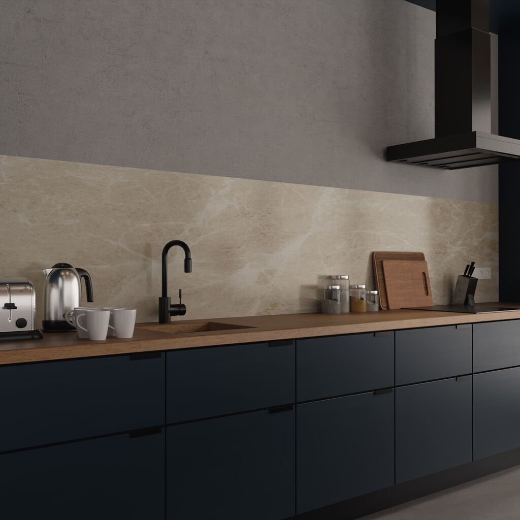 Our cream marble wall panels offer a chic look to your kitchen, bathroom, or toilet. Crafted from ACP, a prime choice for durability and simple installation. This panel is both sturdy and lightweight, comprising thin aluminium layers with a plastic core in between. It’s entirely waterproof, making it perfect for moist spaces like the shower. The matte finish will seamlessly add a touch of elegance to your interior without any hassle. And the best part? You can put it up three times faster than traditional tiles.